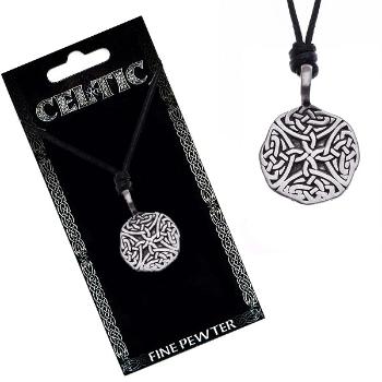 Šnúrkový náhrdelník, kovový plochý prívesok, keltský motív.