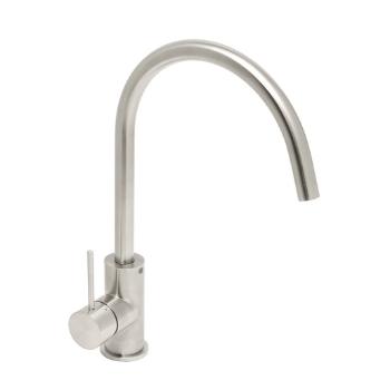 Páková stojanková drezová batéria s otočným ramienkom. V okrúhlom dizajne v nerezovom prevedení. Výška batérie je 36,3 cm. Ramienko je vo výške 23,2 cm. S matným povrchom