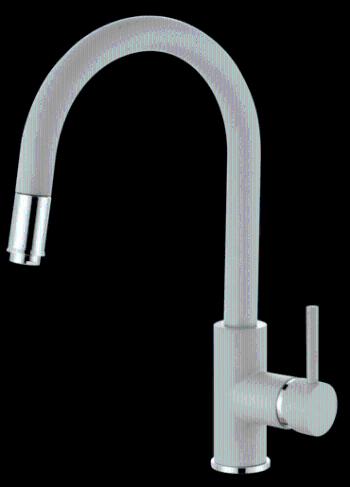 Páková stojančeková drezová batéria s vyťahovacou sprškou. V oblom dizajne. V chrómovom prevedení. Výška batérie je 28,6 cm. Ramienko je vo výške 25,4 cm.
