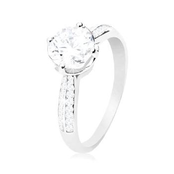 Strieborný prsteň 925, zásnubný, číre zirkónové ramená, okrúhly zirkón v kotlíku - Veľkosť: 54 mm