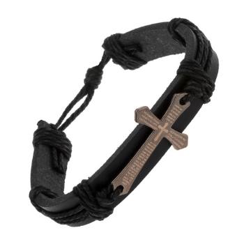 Náramok z tmavohnedej kože a šnúrok, veľký lesklý kríž s modlitbou