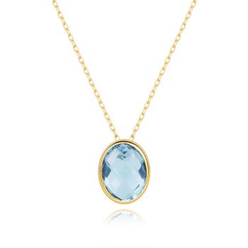 Náhrdelník vyhotovený v žltom 14K zlate má jemnú retiazku zo skosených oválnych očiek, ktoré sa na seba napájajú kolmo. Ozdobený je modrým prírodným topásom oválneho tvaru. Topás má povrch vybrúsený do kosoštvorcov. Uložený je v hladkom leme s lesklým povrchom. Prívesok je k retiazke uchytený pomocou očka v zadnej časti prívesku, ktoré má tvar obráteného písmena T. Náhrdelník sa zapína na pérový krúžok.