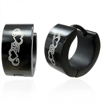 Oceľové náušnice čiernej farby, lesklý a hladký povrch, ozdoby - špirálovité línie a obrysy srdiečok v striebornom odtieni.