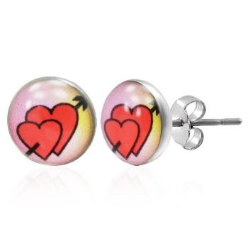 Oceľové náušnice s puzetovým zapínaním, červené srdce prepichnuté šípom na bielom podklade.