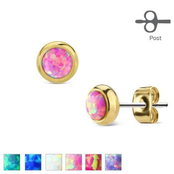 Náušnice z ocele 316L zlatej farby s okrúhlym syntetickým opálom - Farba: Modrá