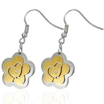 Náušnice z ocele 316L, kvietok zlatej farby na podklade v striebornom odtieni s výrezom srdiečka a zirkónikom, háčiky.