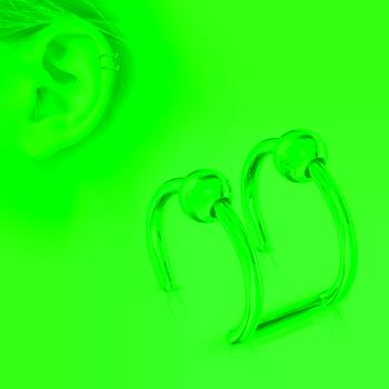 Falošný piercing do ucha z chirurgickej ocele, dva zaoblené prúžky s guľôčkami, lesklý povrch.