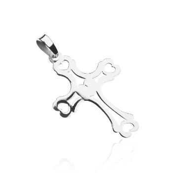 Strieborný prívesok v tvare kríža so srdciami na cípoch a v strede.