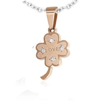 Prívesok z chirurgickej ocele striebornej farby, lesklý list so štruktúrovaným povrchom, dva okrúhle zirkóny čirej farby.