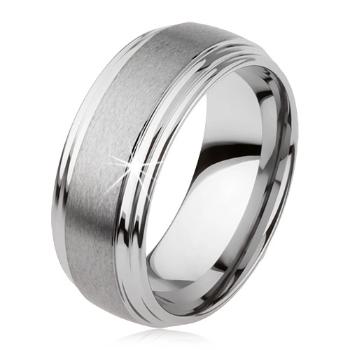 Wolfrámová obrúčka striebornej farby s vysokým leskom, jemné zárezy po okrajoch, matný povrch.