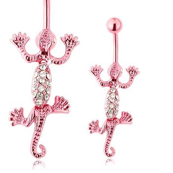 Piercing do brucha z chirurgickej ocele, ružová pohyblivá jašterica, číre zirkóny