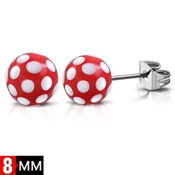 Oceľové puzetové náušnice, červené guľôčky z akrylu, posiate mierne vypuklými bielymi bodkami.