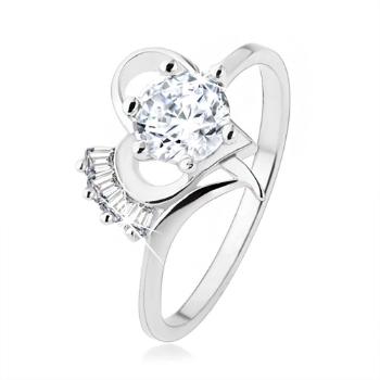 Zásnubný strieborný prsteň 925 s výrazným okrúhlym zirkónom v kontúre asymetrického srdca, lichobežníkové zirkóniky.