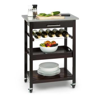 Luxusný odkladací priestor do kuchyne, jedálenských priestorov či obývačiek. Klarstein Vermont kuchynský vozík je vždy tam, kde je potrebný dodatočný priestor a prezentuje sa ako pastva pre oči medzi kuchynskými sluhami. Zhotovený kompletne z dreva, stavia Vermont kuchynský vozíček nie len na vzhľad, ale aj na trvácnosť. Priestor pre všetko: na štyroch poschodiach kuchynského vozíka Klarstein Vermont sú usporiadane umiestnené príbory, zásoby, fľaše a iné kuchynské potreby. O to sa postará mriežka, priestor na podnos, mriežka na fľaše a vrchná zásuvka. Ako obzvlášť praktický sa ukázal vyberateľný servírovací podnos. Poriadok a odkladací priestor tvoria jednu polovicu a pracovná plocha druhú. Na prípravu jedál máte k dispozícii 2400 cm² pracovnej plochy z ušľachtilej ocele. So svojimi pevnými gumenými kolieskami sa servírovací vozík ľahko kĺže dokonca aj po koberci. Tak si vykonáva kuchynský sluha radostne svoju prácu ako servírovací stôl alebo odkladací stolík. Ušľachtilý a vysokokvalitný: Klarstein Vermont kuchynský vozík je luxusný pomocník v kuchyni vyrobený z tmavohnedého lazúrovaného dreva s vrchnou časťou z ušľachtilej ocele.