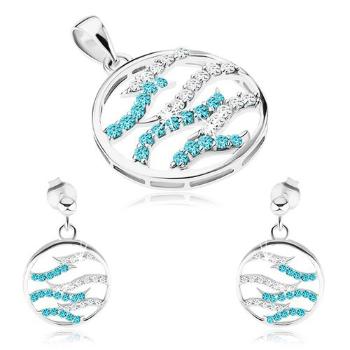 Strieborný set 925, náušnice a prívesok, kruh, číre a modré zirkónové vlnky