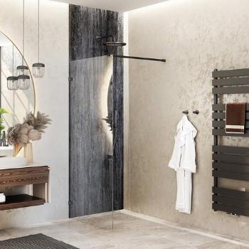 Sprchová zástena walk-in bez vaničky a farbou profilov v čiernej farbe, výplň je z číreho skla bez dekoru. S povrchovou úpravou RothETC, ktorá zaisťuje jednoduchšie čistenie skla vďaka svojmu vodeodpudivému efektu. Po takto ošetrenom skle steká voda v pramienkoch ihneď preč a berie so sebou väčšinu nečistôt aj vodného kameňa. Posuvný systém otvárania. Určenie - pravá orientácia.