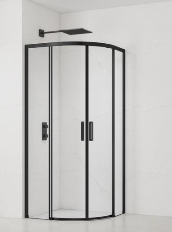 Sprchový kút s dverami v čiernej farbe, výplň je vyrobená z číreho skla bez dekoru. Výrobok má povrchovú úpravu Easy Clean, ktorá uľahčuje čistenie a minimalizuje usadzovanie vodného kameňa. Posuvný systém otvárania. Orientácia - ľavá a pravá orientácia.