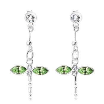 Visiace náušnice, striebro 925, vážka so zelenými a čírymi krištáľmi Swarovski