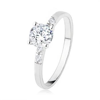Jemný prsteň zo striebra 925, veľký okrúhly číry zirkón, zdobené ramená prsteňa malými zirkónmi - oddelené vrúbovaním.